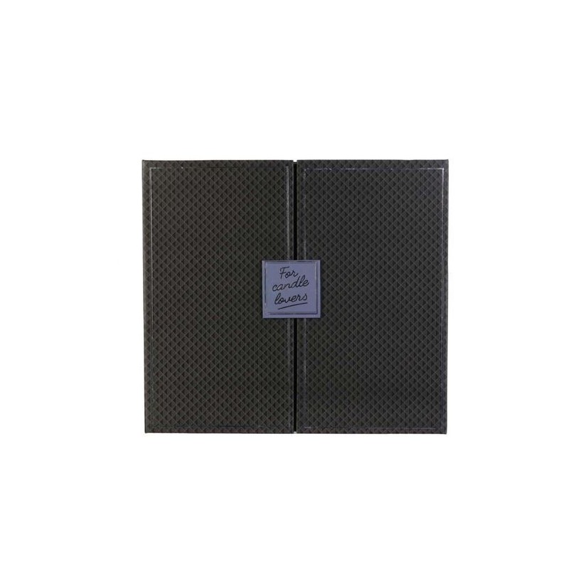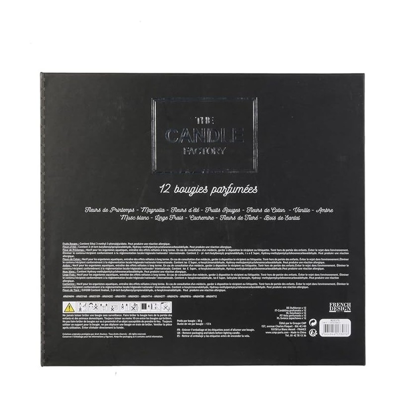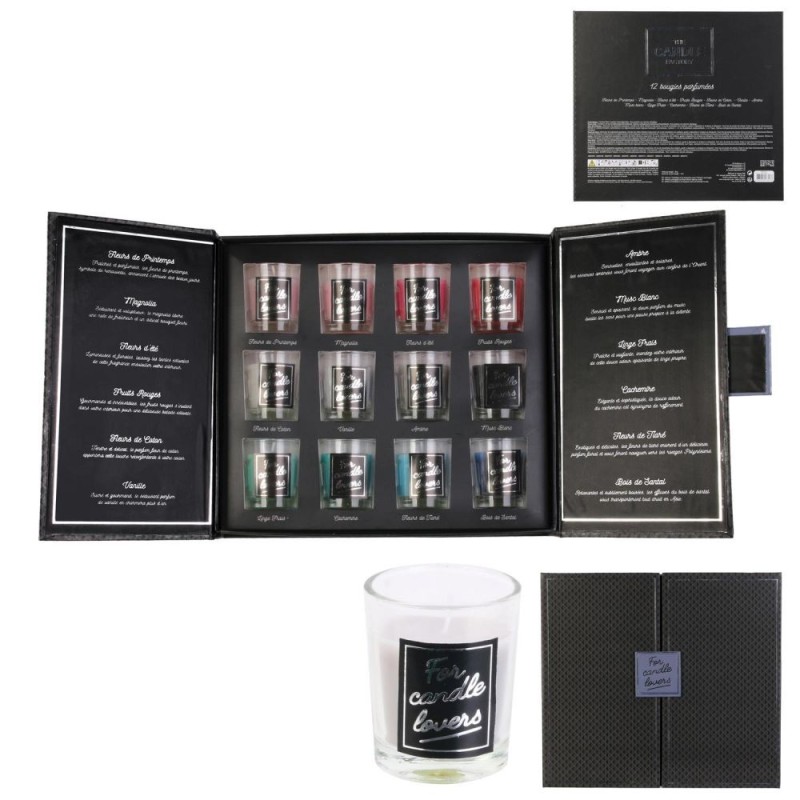 - Coffret de 12 bougies parfumées en pots de verre, présenté dans un emballage noir élégant