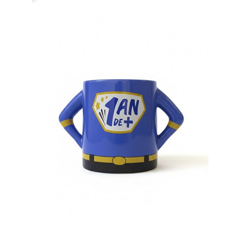 • Mug bleu décoratif « 1 An et + », idéal pour offrir lors d’un anniversaire.
