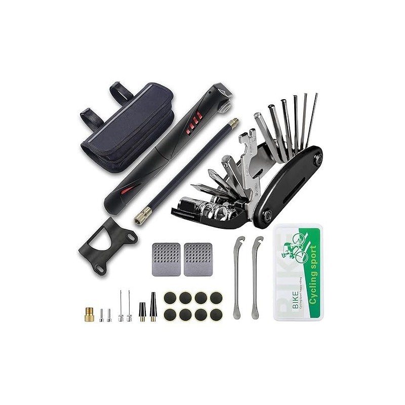 Le kit se présente sous la forme d'une sacoche de transport compacte contenant généralement les éléments suivants : mini pompe à vélo, outil multifonction (Multi-tool), kit de réparation de crevaison, démonte-pneus.